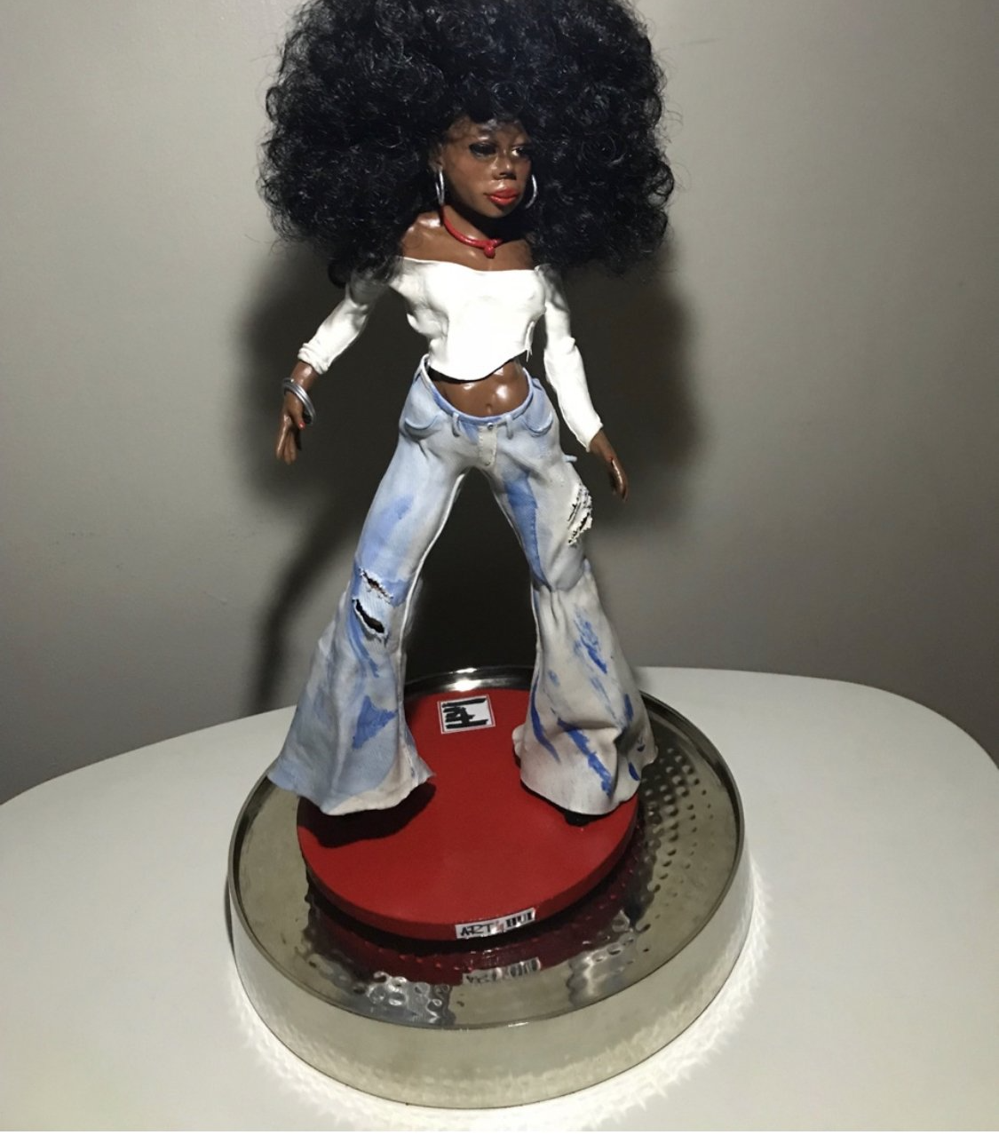 We've launched with our Proud Mary Line of Dolls. With a Beautiful Dark Brown complexion, out of Polymer Clay, standing 14 inches in height sitting on a 6 inch diameter base. Sculpted, wearing ripped denim jeans, a bone white leather cropped top, over-sized bell-bottoms bleached and faded denim look. With the exception of the hair, the metal bracelets and earrings, every piece of her outfit including the Black Leather Boots are sculpted out of Clay.